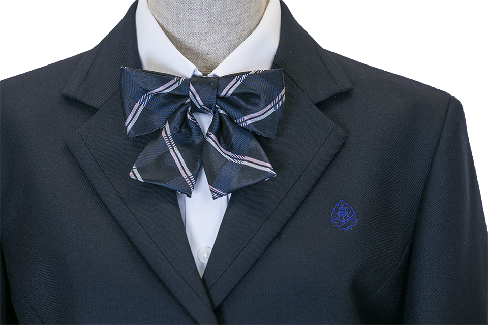 シンプルで着こなしやすい濃紺のシングル3つボタンブレザースタイル。ジャケットは衿端を切り替えたエレガントなデザインです。伝統ある校章はさりげなく胸元にあしらいました。スカートは、濃紺ベースにピンクのラインを入れたキュートなチェック柄。濃紺ベースのネクタイが全体を引き締め、可愛らしさの中にもスタイリッシュさが漂うスタイリングに仕上げました。